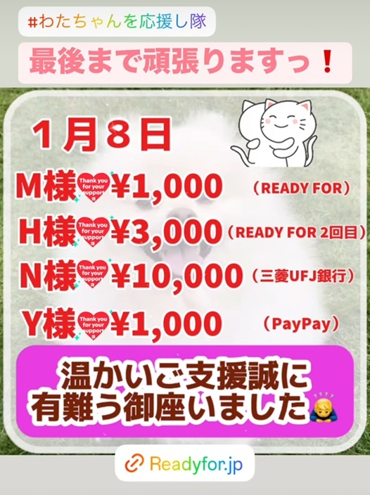 大変心苦しいのですが、日々の治療費など稼ぐことでリターンにかけられる資金がない為、写真付き感謝のメールと活動報告のみでご理解いただけると幸いです。
