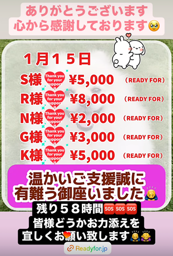 大変心苦しいのですが、日々の治療費など稼ぐことでリターンにかけられる資金がない為、写真付き感謝のメールと活動報告のみでご理解いただけると幸いです。