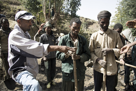 村の人々と話をする現地パートナーのヤレドさん(左)