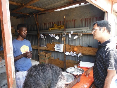 下記の写真は、エチオピアの井戸を作った地域において、井戸の修理道具を都市で調達し、コミュニティで販売する小売店です。コミュニティの人々が、ビジネスとしてこの小売店を立ち上げ、運営していくためのサポートをしました。これによって、井戸の部品を人々が簡単に手に入れて、修理することが可能になります。きちんと伝票などもつけていて、私が訪れた際にも、きれいに整理された伝票を見せてくれました。大勢やってきたため、ちょっとお店の青年が緊張した表情ですが。。。。