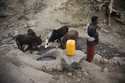 人々が水をくむ場所で、同じく水を飲む動物たち(WaterAid/ Guilhem Alandry)