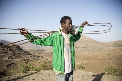 建設作業には、アディ・シバット村の人々が積極的に参加します。人々は、路傍から険しい道を登って水源まで、パイプやセメント、砂利、そして鉄材を運びます。