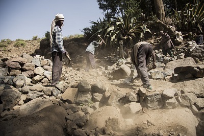 さて、アディ・シバット村でいよいよ設備の建設作業が始まっています!!この写真は、水源となるわき水を囲いで覆って蓋をするのですが、作業の前に、周囲の地面をならしているところです。