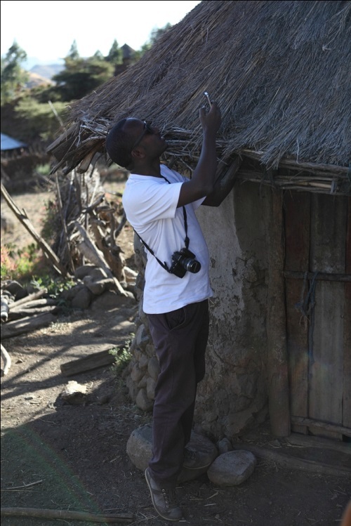 アディ・シバット村は町からとても離れた山奥にあるため、電気もなく、もちろん携帯の電波も届きません。が、WaterAidエチオピア事務所のスタッフが、ほんのわずかに携帯の電波をキャッチする場所を見つけだしました!それが、下の写真。アディ・シバット村で最も標高の高い場所にある家ですが、そのさらに高いところ、屋根のあたりで電波がキャッチできることがわかりました。こうやって石を土台にしてできるだけ高くまで携帯を差し出したうえで、情報を発信しています。この家の住民の方も、いつも快くこの情報発信作業を見守ってくださっています。