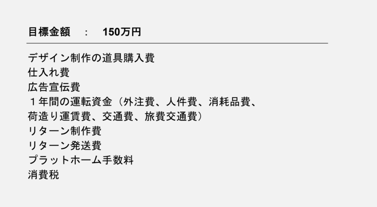 いただいた資金は、デザイン製作の道具購入費(ペンタブレット)・仕入費・広告宣伝費(HP作成、イベント出店)・1年間の運転資金(外注費、人件費、消耗品費、荷造り運賃費、交通費、旅費交通費)・リターン製作費・リターン発送費・プラットホーム手数料・消費税に使用させていただきます。