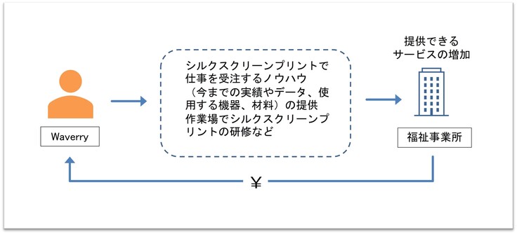 シルクスクリーンプリントで仕事を受注するノウハウを福祉事業所へ提供し対価を得るビジネスや、企業・団体が持つニーズ(販促品、スタッフTシャツ、カレンダーなど)とシルクスクリーンプリント導入済の福祉事業所を繋ぐビジネスへ発展していくことが考えられます。