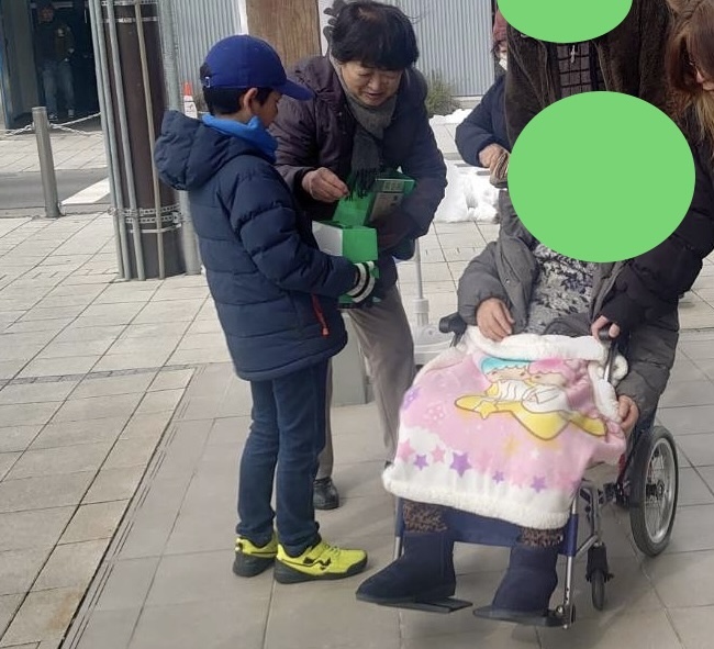寒くて人通りもまばらだったのに、わざわざ遠くから杖をついてあるいてやってきてくださったり、車椅子を停めて募金してくださったり、紙のお金も入れて頂いて、募金したお子さんは、みんなが心配しているのを実感できたようでした。