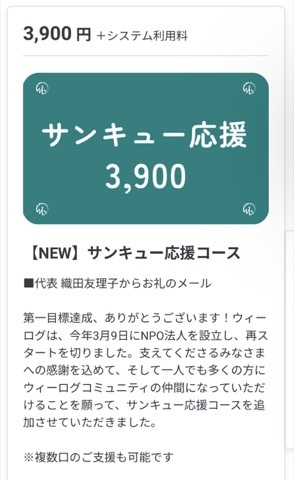 第一目標達成、ありがとうございます!ウィーログは、今年3月9日にNPO法人を設立し、再スタートを切りました。支えてくださるみなさまへの感謝を込めて、そして一人でも多くの方にウィーログコミュニティの仲間になっていただけることを願って、サンキュー応援コースを追加させていただきました。