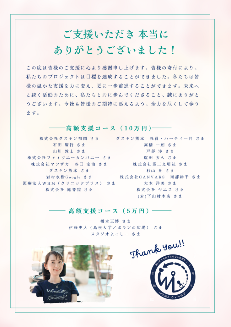 この度は皆様のご支援に心より感謝申し上げます。皆様の寄付により、私たちのプロジェクトは目標を達成することができました。私たちは皆様の温かな支援を力に変え、更に一歩前進することができます。未来へと続く活動のために、私たちと共に歩んでくださること、誠にありがとうございます。今後も皆様のご期待に添えるよう全力を尽くして参ります。