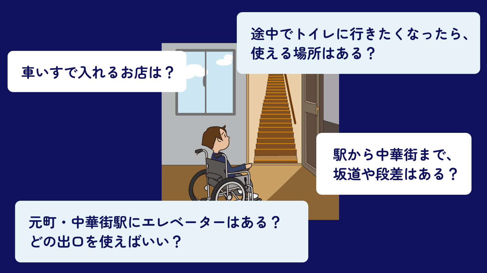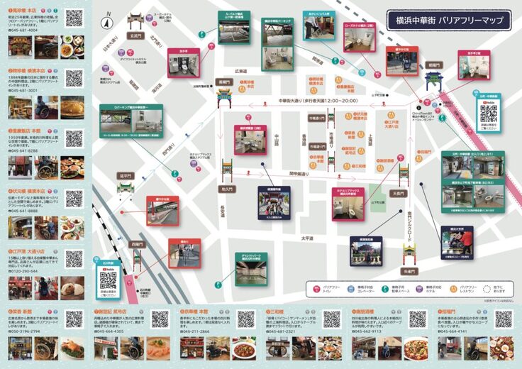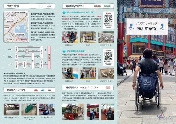 私たちは2021年、横浜中華街の“観光バリアフリーマップ”を公開しました!横浜の方々と協力し、駅から目的地までのアクセス情報、トイレや段差、車いすで入れるお店などの情報をまとめ、 実際の写真や動画付きで紹介したものです。