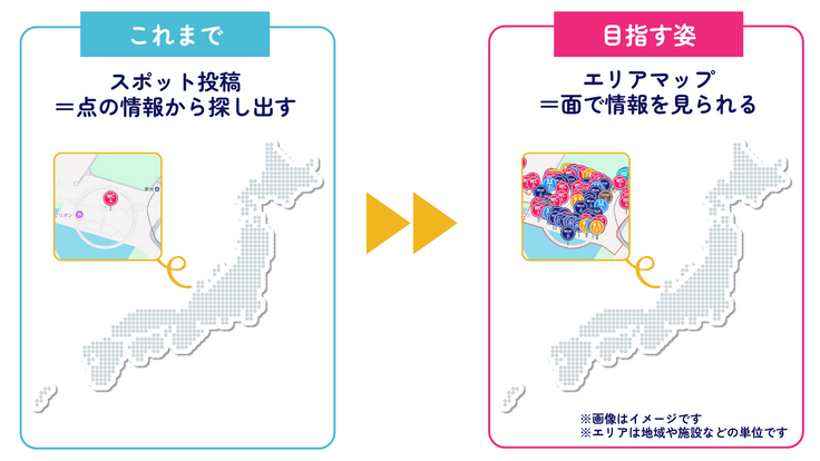 今回のクラウドファンディングでは、地域の情報が集約された「エリアマップβ版」をみんなで作り上げることに挑戦します。これまでは個々のユーザーがそれぞれの場所で、コツコツと情報を積み重ねてきましたが、これからは、そんな皆さんの力を集結させ、「行きたい!」と思えるエリア情報を集中的に増やしていきたいと考えています。
