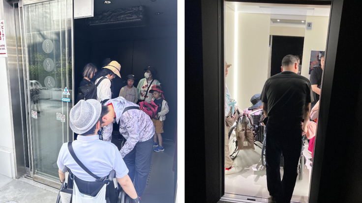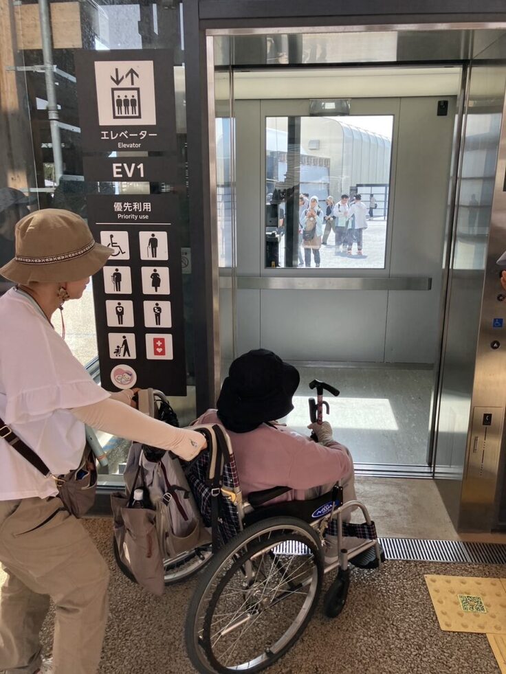 大屋根リングに上がるエレベーターは乗降口にスタッフが配置されていて、スムーズに誘導してもらえます。車椅子、ベビーカーなど計4台が一度に入れました。