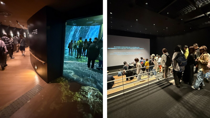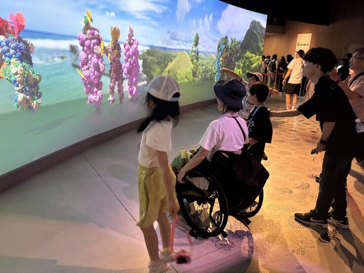 一部展示に狭いところがあり、車椅子・ベビーカーの入場が出来ない展示がありました。入り口の通路が少し狭くて、パビリオンの中のスロープが少しきつくて、車椅子を押す人が少し大変そうでした。スタッフさんはとても親切な方でした。