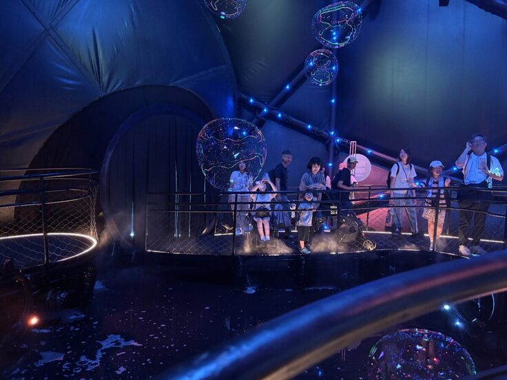 シャボン玉のところがゆるやかな下り坂になっていて車イスユーザーには少し優しくはない。床は少しふわふわしたマットなので、車いすでは少し動きにくそう。坂になっているところや、幅が狭い道もある。