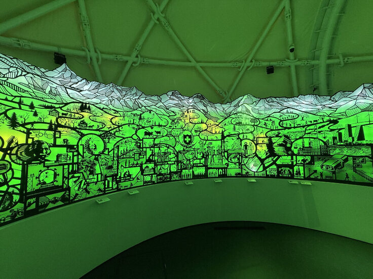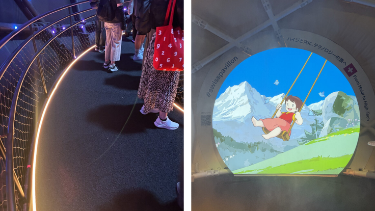 スイス館は、美しい山々や都市を描いた巨大な切り絵の展示から始まり、来場者を魅了します。館内では、大きなシャボン玉が作れるインタラクティブな仕掛けで遊び心を刺激し、最後は誰もが知る「ハイジエリア」で、物語の世界に入り込んだかのようなブランコが展示されています。