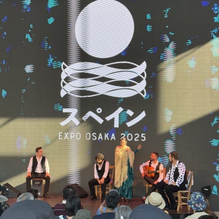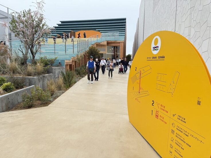 スペイン館は、カラフルな照明と音楽が織りなす空間が特徴で、宙に浮かぶような風力発電のホログラムや、藻類を活用したバイオ燃料・化粧品の研究といった展示もあり、スペインの豊かな文化と先進的なテクノロジーを五感で体験できます。