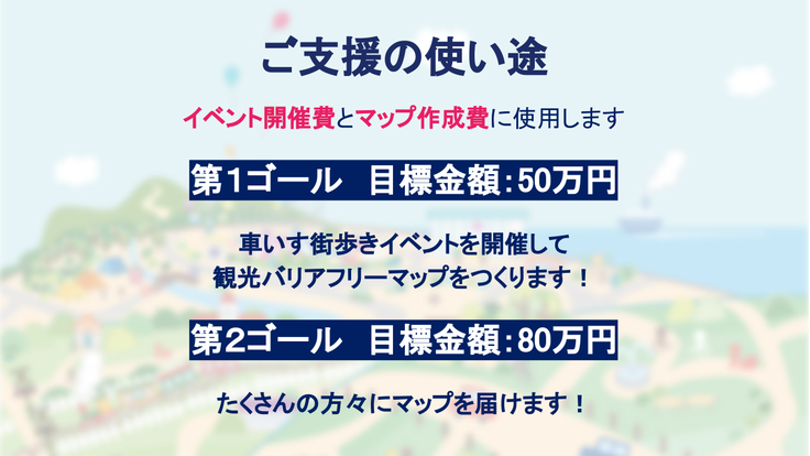 今回のクラウドファンディングでは『横浜の観光バリアフリーマップ』の作成資金を募らせていただきます。作成にかかる費用はイベント開催費とマップ作成費です。