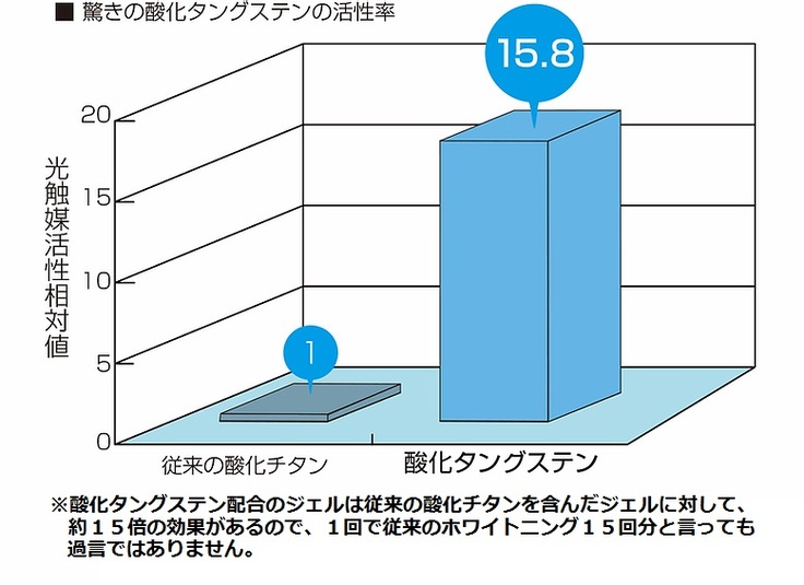 ホワイトニングジェルに含まれる酸化タングステンは、汚れを浮かして自動洗浄する性質や除菌、臭いを消す効果がございます。 この酸化タングステンは、触媒となりLEDライトの光に反応することで、その効果を発揮します。 歯の菌は、清掃剤である酸化タングステン、酸化チタン、ヒドロキシアパタイトでほとんど取り除くことができます。 ヒドロキシアパタイトには細菌を吸着する効果があり、吸着した細菌は、光や空気中の酸素で死滅します。 さらに、ヒドロキシアパタイトはミクロの傷を埋めて修復する作用もあります。 これにより、歯垢やステイン(着色汚れ)の再付着を防止することができるのです。 またジェルにはフッ素を含まないので、インプラントの方も安心して使えます。 以上の理由により歯を白くする、歯のステインを取る、虫歯を防ぐ、口臭を防ぐ、歯のヤニを取る、歯石の沈着を防ぐという特徴を持ちます。続けて行っていただくことで効果を持続していくことができるのです。
