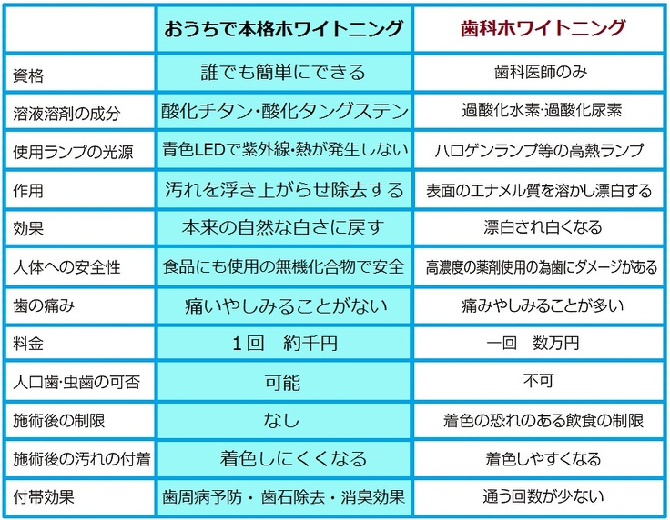 歯医者での施術、ホームホワイトニングと性能を比較してみても、【おうちで本格ホワイトニング】は歯へのダメージ、痛み、悪影響もほとんどありません。
