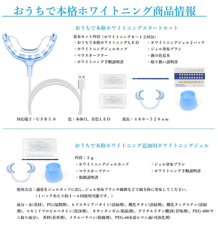 また従来のセルフホワイトニングサロンではジェルの成分がLEDより紫外線に反応する酸化チタンが主でしたが、こちらのホワイトニングジェルは酸化チタンに酸化タングステンという成分を配合しLEDライトや蛍光灯でも反応が出やすいようになっております。回数を重ねることにより、本来の自然な白さに戻してくれる、それが【おうちで本格ホワイトニング】です。