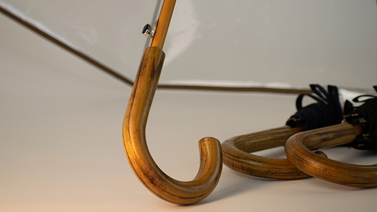 開くと竹のように跳ね上る60cm8本骨、椿手元(プロジェクト限定仕様)のワンタッチ透明傘