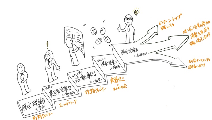 ワイルドライフカレッジでは、以下の図のように理論と実践が交互に繰り返される構成になっており、最終的にはより専門的な保全活動ができるようになれる内容になっています。