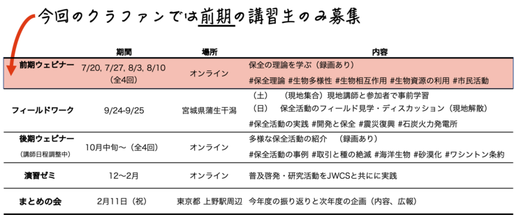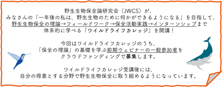 - ワイルドライフカレッジは、前期・後期ウェビナー、フィールドワーク、演習ゼミ、まとめの会、インターンシップを1年サイクルで行うプロジェクトです。このワイルドライフカレッジにかかる費用の一部は、地球環境基金によって3年間助成されます 今回クラウドファンディングで募集する必要金額は、前期ウェビナー参加費と、団体への寄付金となっています。