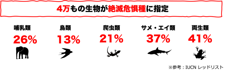 人間の活動の影響を受けて、多くの野生生物が絶滅に脅かされています。