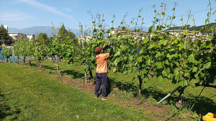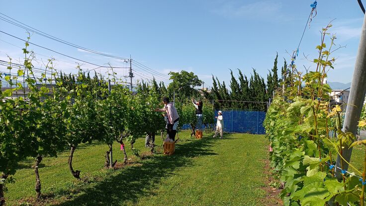 学生とブドウ栽培実習で汗をかく
