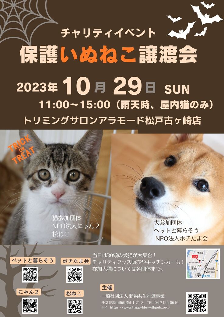翌週29日(日)は、シェルター建設の同敷地内にあるトリミングサロンアラモード松戸古ヶ崎店「ペットコミュニティスペース」での「保護いぬねこ譲渡会」