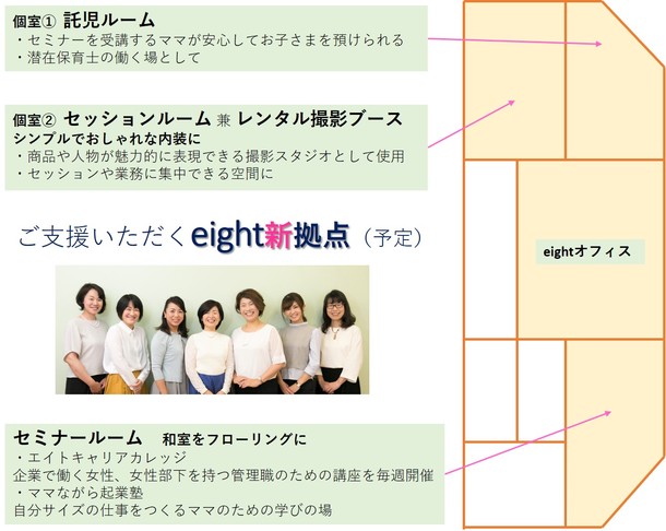私たちが思い描いていた夢により近づくために!eightに来てくれる人がより良い環境で学んで、よし自分もがんばるぞと気持ちを上げて帰ってくれるように!製造業で男性社会の愛知県三河地域の女性たちのキャリアを応援してきた私たちの新しい拠点への移転を応援していただきたいです。