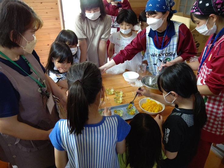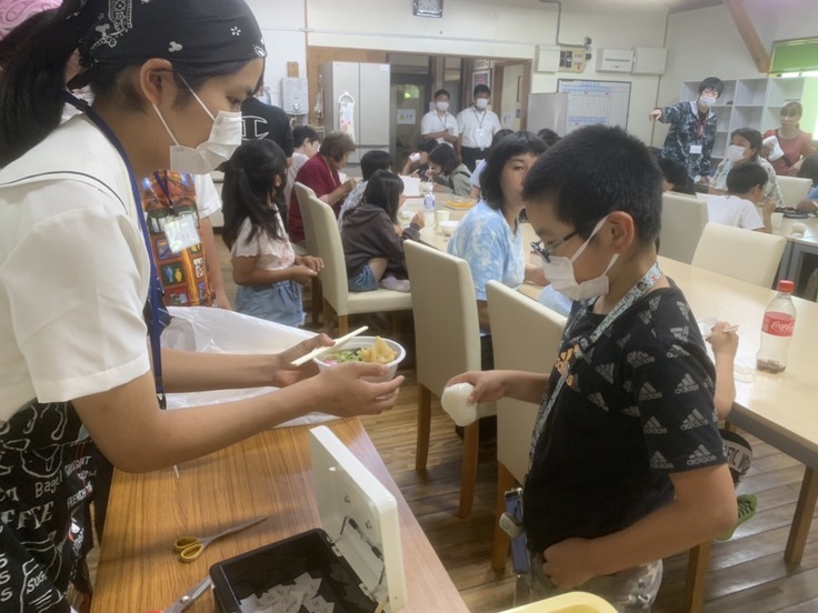 食事については、「うどんが美味しかった」「お腹がいっぱいになった」と言っていただき、子ども達や大人の方々が「久しぶりに会ったね」「大きくなったね」、また、大人の方同士も「○○の時以来に会えて嬉しい」などと交流を図ることが出来ました。ボランティアの方も今回は地元の牛深高校の生徒が13名、第一生命の方が2名、地域住民の方が2名と、調理や受付、案内など大変助かりました。ゼリー作り体験やレクリエーションとして鬼ごっこや折り紙なども行い、子ども達はとても楽しそうにしていました。地域食堂が終わった後でも、楽しいことをしていると友達を連れてきたりしてくれましたが、もう終わっていると知ると「次は必ず来る!」と大盛況でした。