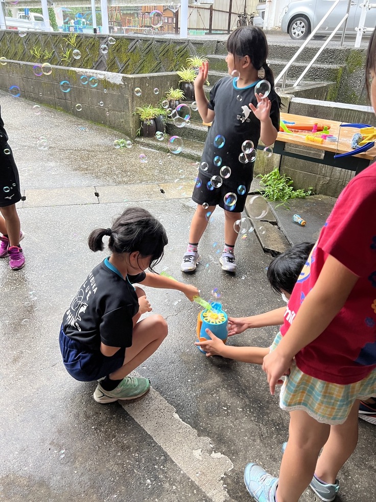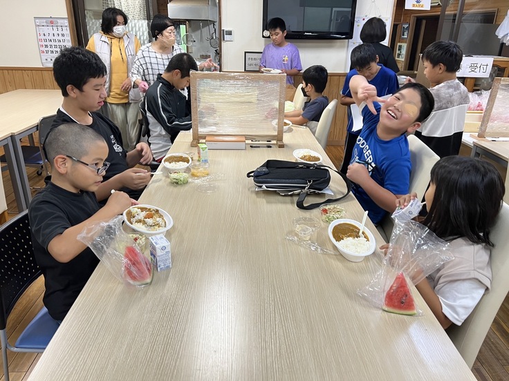 食事については、「カレーの具がいっぱいでおいしかった」「サラダやスイカといっぱいあってお腹がいっぱいになった」「デザートのスイカが美味しかった」と言っていただきました。今回は途中から大雨になってしまい、参加してくれる方がストップしてしまいました。それでも、部屋の中では子ども達がワイワイと元気いっぱいに食べて遊んで大騒ぎでした。