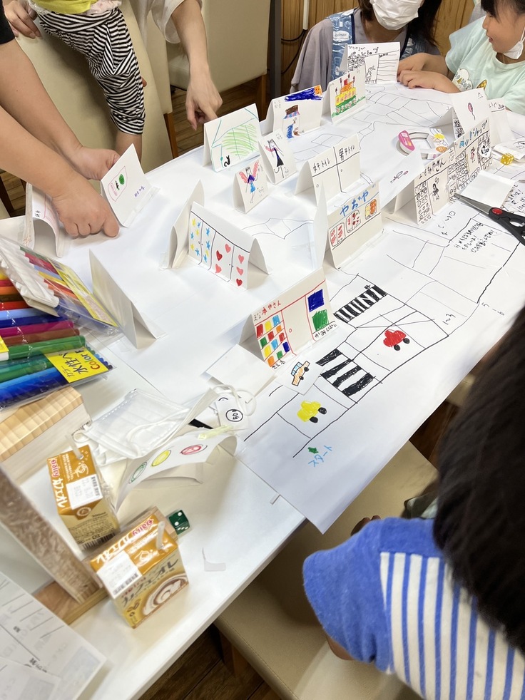ボランティアの方も今回は第一生命の方が2名、婦人会の方が2名、地域住民の方が4名と、調理や受付、子どもの見守りなど大変助かりました。今回は雨の予報だったこともあり、子ども達のレクリエーションとして、シャボン玉やすごろくゲーム作りなどを用意しており、大人との交流のためにお手玉やけん玉といった昔ながらの遊びも用意していました。お手玉やけん玉は予想以上に子ども達は楽しんでおり、すごろくゲーム作りも大人もびっくりなほどクオリティが高いものができており、「次に来た時に遊ぶ!」と楽しそうにしていました。