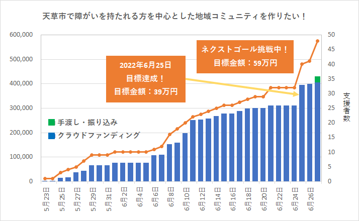 2022年5月23日からプロジェクトを開始し、とうとう残りあと3日となりました。みなさまのおかげで6月25日に目標金額である39万円を達成し、ネクストゴールに挑戦中となります。