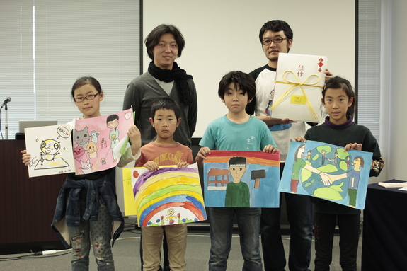(表彰を受けた子ども達。永井努さんと山中悠嗣さんと一緒に)