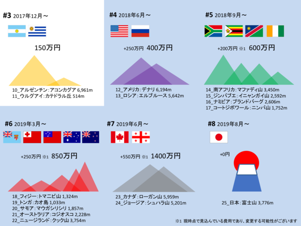 今回皆さんから頂いた資金で、2018年1月~3月の期間のうち、45日間で2つの山を登る予定です。※詳細なスケジュールは2017年12月には確定し、新着情報を通じて皆さんへご案内する予定です。