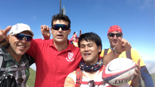 ラグビーボールを脇に抱えながら、ラグビー強豪国の最高峰の山に登り、山頂にトライを決めています。