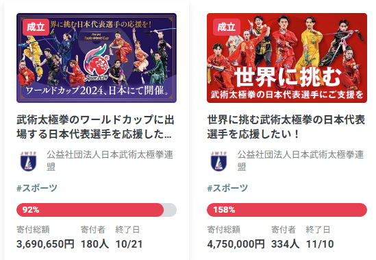 一昨年はアメリカで開催された第16回世界武術選手権大会の遠征費用として初めてクラウドファンディングを実施したのですが総額4,750,000円、日本開催となるワールドカップ大会開催の費用を集めるために、昨年行ったクラウドファンディングでは総額3,690,650円のご寄付を募ることができました。