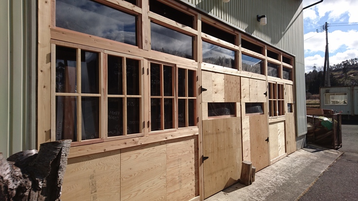 1月は、以前の工房で使用していた内装木材を再利用し、まずは出入口側の壁と扉を製作しました。