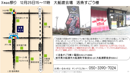 12月25日大船渡のスカイランタン・風船Xmas祭りの会場、大船渡の台所として老舗の活魚すごう様は、2012年からお邪魔させていただき今回の会場としてご快諾くださいました。しかし、大船渡では手紙でつながっていたのは大半が高校生で、課外授業や部活がありXmas祭りへの参加希望は今のところありません。