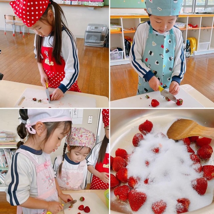 4/25(木)、いちごジャムを作りました。ヘタを切り落とし砂糖を入れ混ぜると、「ピンク色で美味しそうだね」「どんどんジャムになってきたねー」と、目を輝かせていた園児たち☺️