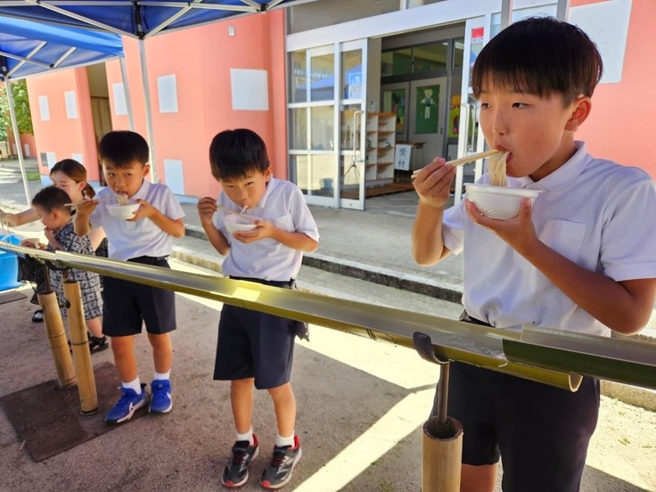 お腹が空いたところで、恒例の流しそうめん!この日のために、山口県青商会と学校オモニ会、下関青商会が準備して下さいました。