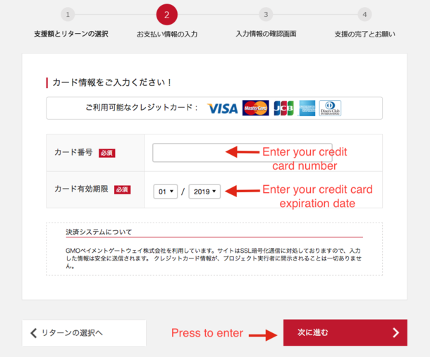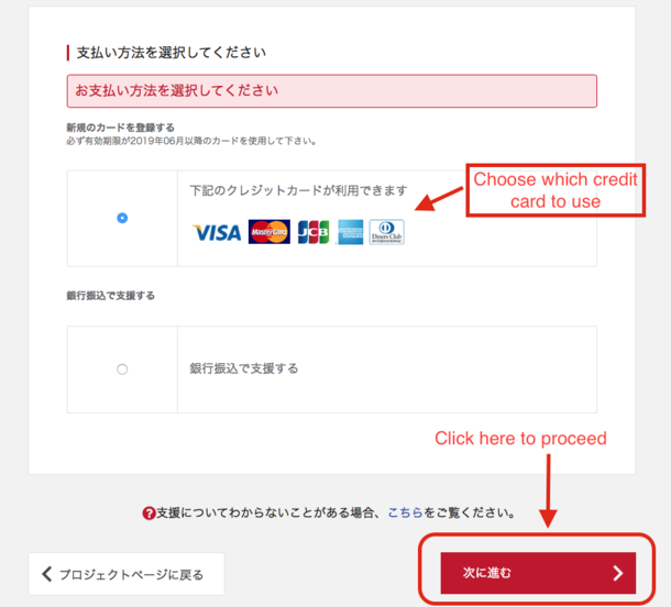 One you see the interface below, please choose how much to pledge. You can select from 8 different courses of 5,000 yen (two types), 10,000 yen (two types), 30,000 yen, 100,000 yen, 300,000 yen, 500,000 yen. (English explanation available only for Rabbit supporters.)