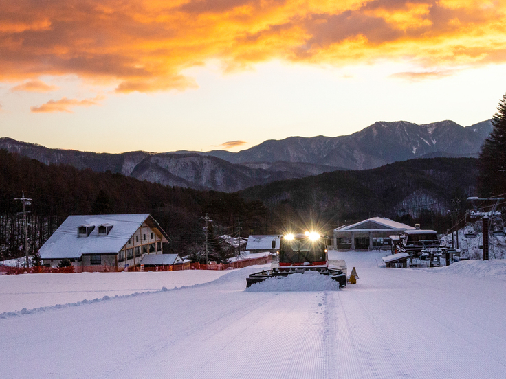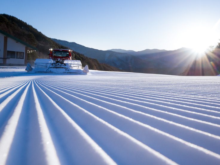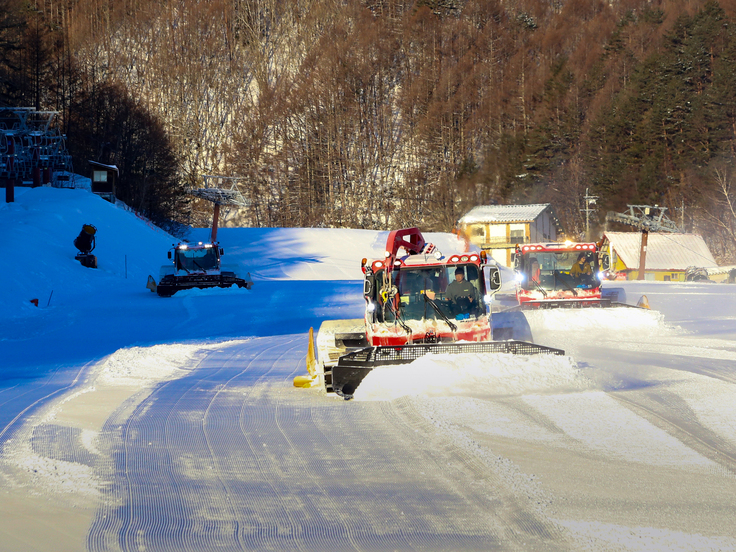 木曽エリアは天然雪が少ないため、人工降雪機 と圧雪車はゲレンデ維持に欠かせない存在です。特にこの地域特有の低温環境では、粒子が細かく溶けにくい高品質な人工雪を作ることができ、滑りやすく上質なゲレンデづくりに繋がっています。