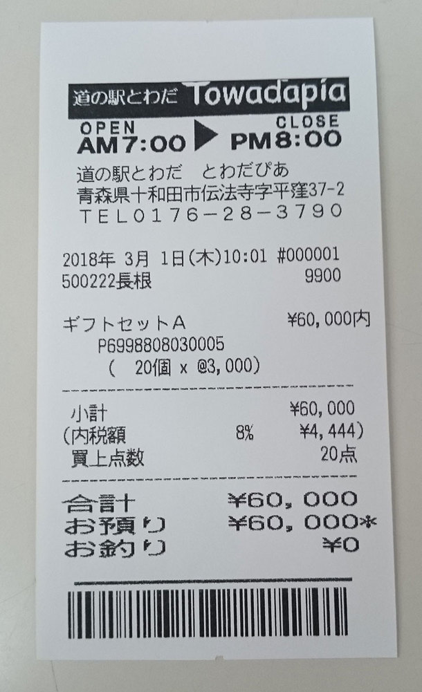 「道の駅とわだ」より購入。20セットで60,000円でした。