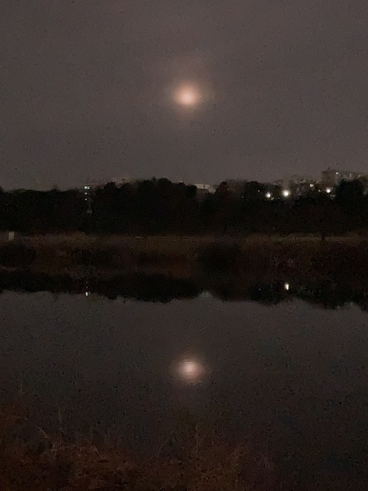 今日は満月でした。新川の対岸から満月と河津桜のツーショットです。