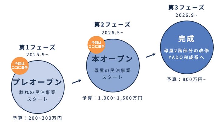 第1フェーズは、離れでテスト的に民泊事業をスタートし、姫路市での民泊事業のノウハウを蓄積。