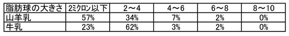 次に、山羊乳は消化が良くおなかに優しいという特徴があります。以下の図のように牛乳に比べて脂肪球が小さく、消化に要する時間が牛乳が60時間に対して山羊乳は24時間とのデータがあります。赤ちゃんから高齢の方、体が衰弱した方などにもやさしいミルクです。