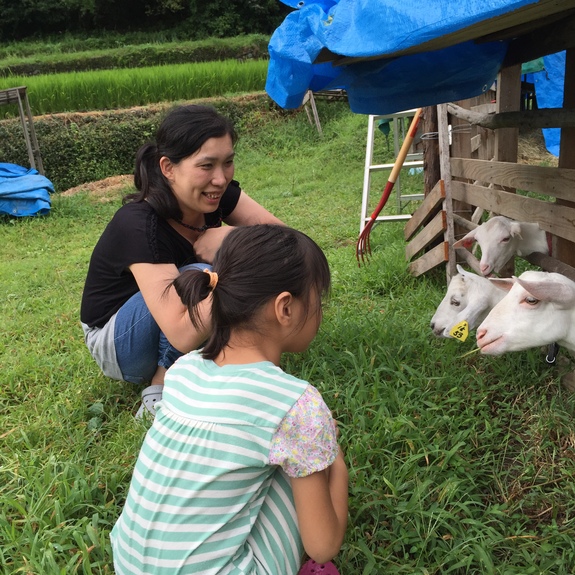 現在近所の子供は小学校の統廃合によって少し離れた小学校にスクールバスで登校しています。学校から帰っても、学校の友達は遠い所に住んでいる事が多く、近所で一緒に遊べる子が減ってきているのです。そんな子供たち、さらに親子のコミュニケーションの場として、山羊と触れ合える場所を提供することが出来ます。現在私のうちでは畑の除草の為に飼っている山羊を見かけ、近くの子供が良く遊びに来てくれるようになりました。犬や猫と違い、あまり触れ合う機会がない動物に最初はおっかなびっくりでしたが、草を与えたりしているうちによい遊び相手になります。また、保護者の方と一緒にこられる事が多いのですが、一緒になって触れ合っていくことが良い親子のコミニュケーションの場となっています。